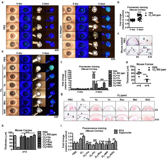 Ex vivo evaluation of chlorine’s effects on mice eyeballs. (a–c) Mouse eyeballs were exposed to 500 ppm Cl2 for 2 h. Subsequently, the eyeballs were washed two times and then incubated in 1x PBS for 2 days. (a) Representative images of murine whole eyeballs showing fluorescein staining with or without Cl2 treatment. (b) Graph showing the intensity fold change of corneal fluorescein staining after application of Cl2 treatment (n = 12/group) for 2 days. Values are the mean ± SEM (n = 11). The results indicate that corneas with 500 ppm Cl2 became opaque and hazy with more fluorescein staining of the cornea and conjunctiva than the PBS-treated group. (c) H&E staining on murine whole eyeballs after application of PBS or chlorine 500 ppm for 2 days. E: epithelium, S: stroma. *: damaged area. (d) Murine cornea thickness after 500 ppm Cl2 exposure. *** p < 0.001 was observed in the cornea thickness vs. the control group (PBS treatment). Values are the mean ± SEM (PBS: n = 11, Cl2: n = 12). (e) Representative images of murine whole eyeballs showed fluorescein staining. (f) Graph showing the intensity fold change of corneal fluorescein staining after application of antioxidants (n = 4/group) for 2 days. *** p < 0.001 was observed in the corneal fluorescein staining vs. the control group (PBS-treated on day 2). ### p < 0.001 was observed in the corneal fluorescein staining vs. Cl2-treated group on day 2. (g) H&E staining on murine whole eyeballs with antioxidants after application of Cl2 500 ppm for 2 days. E: epithelium, S: stroma. *: damaged area. Vitamin A (Va): 100 μM, vitamin C (Vc): 300 μM, resveratrol (Res): 5 μM, melatonin (Mel): 100 μM, and NAC: 500 μM for 2 days. (h) Murine cornea thickness. *** p < 0.001 was observed in the cornea thickness vs. the control group (PBS-treated). (i) Relative fold changes of immunofluorescence intensity from Figure S1c. *** p < 0.001 was observed in the ROS and superoxide groups vs. the control group (PBS-treated). # p < 0.05, ## p < 0.01, ### p < 0.001 were observed in the ROS and superoxide groups vs. the Cl2 treatment group.
