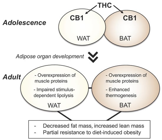 - Lin, L.; Jung, K.M.; Lee, H.L.; Le, J.; Colleluori, G.; Wood, C.; Palese, F.; Squire, E.; Ramirez, J.; Su, S.; et al. Adolescent exposure to low-dose THC disrupts energy balance and adipose organ homeostasis in adulthood. Cell Metab. 2023, 35, 1227–1241.e7. [Google Scholar] [CrossRef]