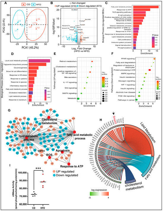Transcriptomic and bioinformatic analyses identify the enhanced Smpd3 expression in the steatotic livers of high-fat diet (HFD)-fed mice. RNA-seq was used to identify potential gene target(s) in the livers of mice fed with a HFD, compared to those fed with a chow diet (CD), 5 mice per group. (A) Principal component analysis (PCA) shows differential clustering patterns in the livers of HFD and CD mice. (B) Volcano plot distribution highlights the differentially expressed genes (DEGs) in the livers of HFD and CD mice. Orange and cyan color dots denote the up- (510) and downregulated (672) significantly DEGs, respectively, while the gray color dots represent non-significant DEGs between CD- and HFD-fed mice. (C,D) Gene Ontology (GO) enrichment analysis based bar plots represent the biological processes that are significantly altered in relation to up- and downregulated DEGs in the liver samples from CD- and HFD-fed mice. X-axes represent the Fold Enrichment, with statistical significance indicated by a numerical value and a color code as shown. (E,F) KEGG pathway analysis of the significantly up- and down-regulated DEGs respectively, in the livers of HFD and CD mice. Dot size indicates the count which represents the number of genes associated with each pathway. Dot color denotes the statistical significance (red being the highest), and the x-axis represents the fold enrichment. (G) Major gene networks interconnectivity including lipid, cholesterol, and fatty acid metabolic processes, apoptosis, oxidative stress by ROS, and ATP response. Orange and cyan color dots represent the up- and downregulated, respectively, DEGs in the livers of HFD and CD mice. (H) Chord plot showing the relationship between genes and top significant GO terms including cholesterol, lipid, and fatty acid metabolism. Genes involved in the enrichment are arranged (on the left) in order of their expression level (−log of fold change). (I) Increased nSMase2 activity level in in the livers of HFD mice, compared to CD mice. *** p ˂ 0.001.