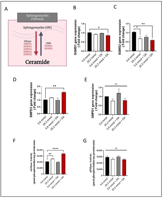 Increased Smpd3 expression and nSMase2 activity in HepG2 cell model of steatosis. HepG2 cells were cultured in normoglycemic (5.6 mmol D-glucose) or hyperglycemic (25.2 mmol D-glucose) conditions, in the presence or absence of oleic acid (OA) stimulation. Gene expression of SGMS1 and SGMS2 was determined using RT-qPCR; nSMase2 and aSMase activities were determined using commercial kits as described in Materials and Methods. (A) Schematic representation of the main sphingomyelin (SM) pathway. Reduced gene expression of (B) SGMS1 and (C) SGMS2 in HepG2 cells under glucolipotoxic conditions. (D) Increased Smpd3 gene expression in HepG2 cells under glucolipotoxic conditions. (E) Smpd1 gene expression in HepG2 cells differed non-significantly between glucolipotoxic and normal conditions. (F) Increased nSMase activity in HepG2 cells under glucolipotoxic conditions. (G) aSMase activity in HepG2 cells differed non-significantly between glucolipotoxic and normal conditions. All data are expressed as mean ± SEM. * p ≤ 0.05, ** p ≤ 0.01, **** p ≤ 0.0001, ns: non-significant.
