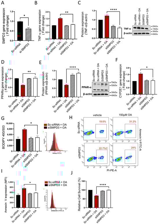 Next, we asked if the nSMase2 deficiency was sufficient to improve steatosis-associated changes in the HepG2 cells model. To this end, genetic suppression of nSMase2/Smpd3 by siRNA rendered a moderate level ~30–40% transcriptional repression, compared to control (expression in scrambled siRNA-transfected cells) (Figure 6A). Notably, even at this moderate level of suppression, the nSMase2 deficiency caused a significant reduction in TNF-α transcripts (Figure 6B) and protein expression (Figure 6C) in HepG2 cells under steatosis-inducing conditions, implying that nSMase2 had a potential role in inducing inflammation in this model of steatosis. As expected, genetic suppression of nSMase2/Smpd3 also improved oxidative stress, as indicated by upregulation of PPARα gene (Figure 6D) and protein (Figure 6E) expression as well as by transcriptional downregulation of CYP2E1 (Figure 6F). In addition, nSMase2 deficiency also led to a significant reduction in intracellular lipid accumulation (Figure 6G) and improved cell survivability (Figure 6H–J). Overall, these results highlight the potential role of nSMase2 in driving steatosis-related pathological changes in the HepG2 cell model.