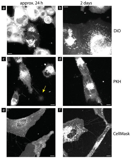 Remaining staining results one day and two days after labeling of DiO (a,b), PKH (c,d), and CellMask™ Plasma Membrane (e,f) in U87 cells. The main problem with DiO and PKH is the inhomogeneous labeling. After 24 h, there are some cells labeled with DiO whose plasma membrane is barely visible (a). The same problem occurs with PKH. After 21 h, some cells are hardly visible, and only some vesicles are visible ((c), yellow arrow). The internalization of the dye increases the signal of the vesicles inside the cells, so that after 2 days, the vesicles are completely overexposed, while the plasma membrane shows only a very weak signal (b,d). The internalization of the CellMask™ Plasma Membrane stains is slower compared to DiO and PKH. (e) At 26 h after the labeling with CellMask™ Green Plasma Membrane. (f) At 2 days after the labeling with CellMask™ Orange Plasma Membrane, the membrane as well as small membrane structures such as filopodia and TNTs are still well visible, and also the SNR is still good. All images are maximum projections of confocal images. Brightness and contrast were not adjusted. Scale bar: 10 µm.