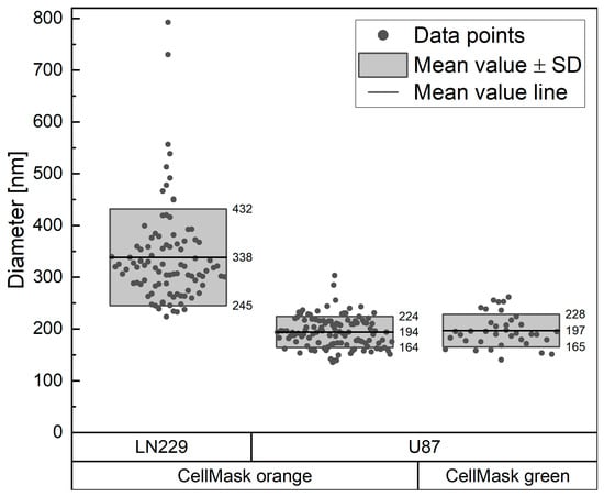 TNT diameters of LN229 and U87 cells were measured by STED microscopy. One point represents one TNT. The lines show the mean values and the borders of the boxes show the range within the standard deviation (SD). Measurements included 93 TNTs from LN229 cells, 113 TNTs from U87 cells labeled with CellMask™ Orange Plasma Membrane, and 37 TNTs from U87 cells labeled with CellMask™ Green Plasma Membrane.