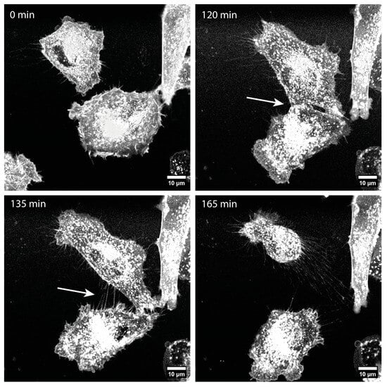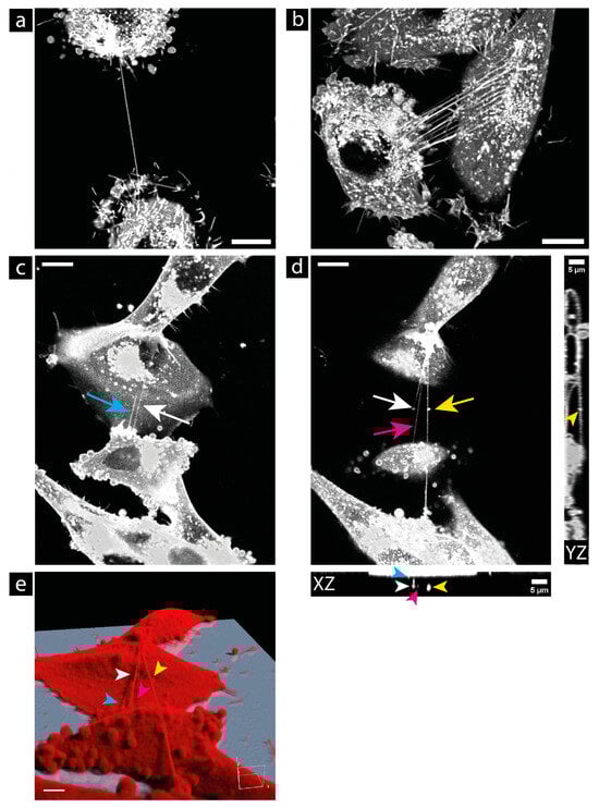 - Dubois, F.; Bénard, M.; Jean-Jacques, B.; Schapman, D.; Roberge, H.; Lebon, A.; Goux, D.; Monterroso, B.; Elie, N.; Komuro, H.; et al. Investigating Tunneling Nanotubes in Cancer Cells: Guidelines for Structural and Functional Studies through Cell Imaging. Biomed. Res. Int. 2020, 2020, 2701345. [Google Scholar] [CrossRef]