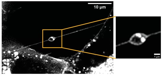 Most TNTs appeared as straight thin lines between the cells in 2D cell culture and were usually located above the substrate. In glioblastoma cells, TNT connections can consist of one single TNT (see Figure 4a) or several TNTs (see Figure 4b). In the latter case, it is often difficult to distinguish the individual TNTs from each other because they are tightly packed. TNTs can be found at the full height of the cells (see Figure 4c–e). They can be near the bottom, at the top of the cells, or somewhere between. The four TNTs shown in this image are marked by arrows of different colors. The different heights of the TNTs can be seen nicely in the provided XZ view in Figure 4d and in the simulated fluorescence (Sfp) rendering in Figure 4e. Due to this feature, it is important to image a full z-stack of the cells if one wants to capture all TNTs. TNTs are not necessarily horizontal to the substrate, but are often oblique. One of the most important features of TNTs is their small diameter. This morphological feature is the one that allows them to be distinguished from other larger membrane connections (>1 µm) such as EP bridges or microtubes (see Figure S4). Figure 5 shows some rare morphological features of TNTs in glioblastoma cells. In the U87 cells, we found complex TNT connections linking several cells together by a junctional connection of the TNTs (see Figure 5a,b). A TNT can also be bent over obstacles such as other cells (see Figure 5c). The TNT becomes anchored to the obstacle cell, which is then included in the TNT network and acts as a connected partner (see Video S5). This feature, as well as the fact that some TNTs branch out at their ends (see Figure 5d), was found in both cell lines. Also, the diameter of a TNT can vary along its length, and bulges or anchored vesicles can be found (see Figure 4d and Figure 6). These bulges may indicate that cargoes larger than the TNT diameter are being transported along the TNTs. In both cell lines, U87 and LN229, large bulges, so-called gondolas, were found. Gondolas can carry enclosed organelles larger than the diameter of the nanotube itself. In Figure 6, the observed gondola is enlarged on the right side to show the contents of the gondola in more detail. We can only speculate what cargo was being transported. However, it can be seen that it carried at least two vesicles and a considerable amount of cytoplasm, which appears completely black due to the absence of lipids. This bulk of cytoplasm could contain several cell organelles, such as mitochondria. Other encapsulated cargoes may be transported within the vesicles. The formation and generation of the force required to move such a bulk vessel are unexplored. The movement may be driven by differences in the chemical potential of the molecules in the bulk solution and the interior of the target cell, or by the composition of the gondola membrane and the target cell membrane []. However, we rarely observed such gondolas. In the experiments, only one gondola was found in the 197 connections analyzed in the LN229 cells, and three gondolas were found in the 426 connections analyzed in the U87 cells. Video S6 shows the movement of the gondola shown in Figure 6 along the TNT.