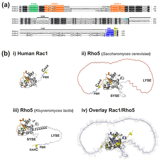 Structures of two yeast Rho5 proteins and human Rac1. (a) Alignments of primary sequences revealing conserved structural motives. Multiple sequence alignments are based on ClustalW, using the MUSCLE tool ([31]), and were graphically curated with GeneDoc version 2.5.000 (National Resource for Biomedical Supercomputing, Pittsburgh, PA, USA). Functional cysteine residues mentioned in the text are highlighted in yellow or light blue. (b) Structures of the human and yeast GTPases predicted by the AlphaFold program [32,33] and comparison of human Rac1 with Rho5 from Saccharomyces cerevisiae. Structures were obtained from the AlphaFold Protein Structure Database ([34], with accession numbers A0A816AYR0 for ScRho5, A0A5P2U790 for KlRho5, and P63000 for Rac1) and visualized using PyMOL (Schrödinger and DeLano, PyMOL, 2020; accessed on 20 December 2024 at http://www.pymol.org/pymol). In images (i–iii), the conserved switch I, switch II (both in orange), and P-loop sequences (green) are highlighted within the globular catalytic core. The C-terminal cysteine residues (yellow spheres) are modified by geranylgeranylation after removal of the AAX sequence (two aliphatic and a third, variable amino acid residue) during posttranslational modification. The preceding polybasic region (PBR) is shown in blue. The long and short yeast-specific extensions (LYSE and SYSE, respectively) are indicated for the two yeast homologues as basically unstructured strings, starting with a helix in Kluyveromyces lactis. For the overlay of human Rac1 with Rho5 from S. cerevisiae (structures i + ii presented in iv), the entire structures are depicted in yellow and blue, respectively.