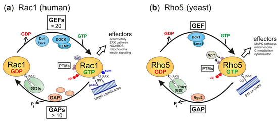 Regulatory circuits and ancillary proteins affecting the activation state of Rac1 (a) and Rho5 (b). The GTPases are shown in their inactive, GDP-bound state, and their active, GTP-bound, state. Ancillary proteins for the interconversion are GEFs (GDP/GTP exchange factors), GAPs (GTPase-activating proteins), and GDIs (GDP dissociation inhibitors), with the latter believed to shield the lipid modification to facilitate traveling through the hydrophilic cytosol. For human Rac1, a variety of GEFs and GAPs have been identified, with GEFs belonging to either the DOCK or the Dbl type (note that the DOCK/ELMO complex is depicted as an example of the former, as it coined the names of the yeast GEF subunits). PM = plasma membrane, OMM = outer mitochondrial membrane. Abbreviations for posttranslational modifications (PTMs) are P = phosphorylation, ubi = ubiquitinylation, sum = sumoylation, AMP = adenylation, palm = palmitoylation, gg = geranylgeranylation. See text for further details on the effectors listed.