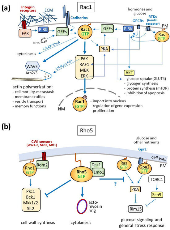 The role in cell cycle regulation exerted by Rac1 in mammalian cells does not seem to be conserved for yeast Rho5. Specifically, Rac1 can translocate to the nucleus upon its phosphorylation by ERK (extracellular signal receptor kinase) and participate in transcriptional regulation (Figure 3a; [121]). More global effects on Rac1-dependent gene expression are achieved through its activation of different mitogen-activated protein kinase (MAPK) cascades, with the phosphorylation of transcription factors by their downstream kinases ERK, p38, and JUNK (reviewed in [40]). Frequently, this is enhanced by the activation of the upstream p21-activated kinase (PAK) by Rac1 [122,123,124] (see [12] for an extensive review).