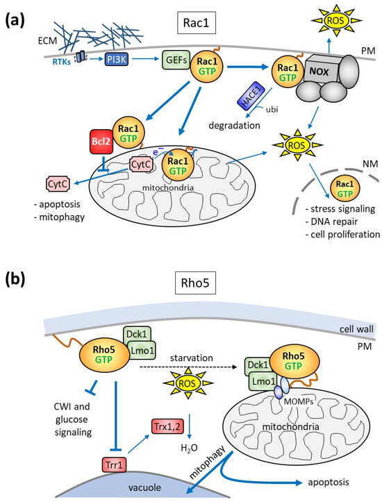 Apart from the physiological functions presumably exerted following their activation at the plasma membrane described above, accumulating evidence suggests that Rac1 and Rho5 participate in the production of reactive oxygen species (ROS) and the regulation of mitophagy and apoptosis. This can be achieved either by promoting an oxidase activity or when the GTPases are translocated to mitochondria in both mammals and yeast (Figure 4; [12,13,41]). These relations have been more extensively studied for mammalian Rac1 in the contexts of cancer development, immune response, brain functions, and diabetes, with some striking similarities observed for its fungal homologues, as outlined below.