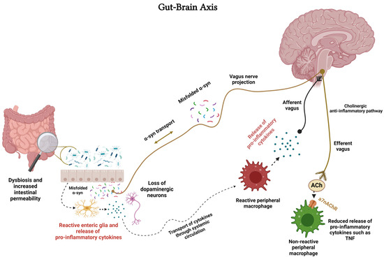 - Claudino dos Santos, J.C.; Lima, M.P.P.; Brito, G.A.d.C.; Viana, G.S.d.B. Role of Enteric Glia and Microbiota-Gut-Brain Axis in Parkinson Disease Pathogenesis. Ageing Res. Rev. 2023, 84, 101812. [Google Scholar] [CrossRef] [PubMed]