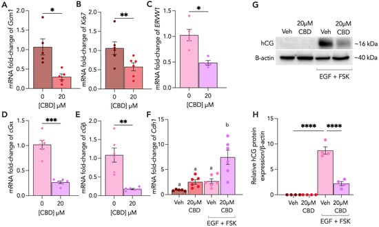 (A) 20 µM CBD treatment disrupts trophoblast differentiation, proliferation, fusion and hormone production. Undifferentiated (CT) and differentiated (ST) BeWo b30 cells were treated with 20 μM CBD over 48 h. (A,B) Changes in mRNA levels of Gcm1 and Ki67 were assessed in CTs and (C–E) mRNA levels of ERVW1, CGα and CGβ were assessed in STs, and all were normalized to 18S and β-Actin using RT-qPCR (n ≥ 5 biological replicates), relative to vehicle (Veh) controls. (F) Changes in mRNA levels of Cdh1 were assessed in both CTs and STs and were normalized to 18S and β-Actin using RT-qPCR (n ≥ 5 biological replicates). (G,H) Changes in protein levels of hCG (n = 4 biological replicates) were assessed using Western blotting and normalized to β-actin expression. Cell lysates (25 μg/lane) of each treatment were loaded on SDS-PAGE and quantified using a rabbit polyclonal anti-hCG (DAKO, GA508) antibody. CT vehicle = 0.1% methanol; ST vehicle = 0.1% methanol, EGF and FSK. Results were plotted as mean ± SEM and compared using either a Student’s t-test (for groups ≤ 2), or one-way ANOVA (for groups ≥ 3): p < 0.05 (*), p < 0.01 (**), p < 0.001 (***), p < 0.0001 (****). Statistically significant changes were represented by distinct letters on bar graphs where any different letter represents a significant difference of at least p < 0.05.