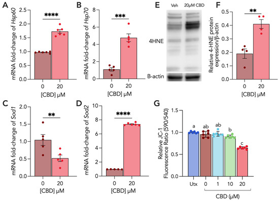 To understand the biochemical changes underlying the effects of CBD on CTs, we first sought to characterize two markers of cellular stress, HSP60 and HSP70, as well as two key antioxidant markers, superoxide dismutases SOD1 and SOD2, following CBD exposure. We observed a 30% decrease and 3.7-fold increase in HSP60 and HSP70 mRNA levels, respectively (Figure 2A,B). We found that SOD2 mRNA levels were increased by 6.4-fold (Figure 2D), whereas SOD1 levels were decreased 0.5-fold (Figure 2C). Given the considerable reduction in the SOD1 antioxidant defense component, we further assessed intracellular ROS levels by performing the DCFDA assay in CBD-treated CTs and found that intracellular ROS levels remained unchanged with CBD treatment (Figure S2). Considering the changes to antioxidant defenses, we assessed the cellular levels of 4HNE, a marker of lipid peroxidation and oxidative damage [26]. CBD treatment resulted in a 53% increase in 4HNE protein adducts (Figure 2E,F). Finally, we assessed mitochondrial membrane potential (ΔΨm) and observed a 10% decrease in mitochondrial membrane potential with 10 µM CBD and a 36% decrease with 20 µM CBD (Figure 2G).