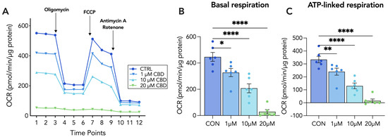 Mitochondrial function is impaired following 20 µM CBD treatment in CT cells. Undifferentiated (CT) BeWo b30 cells were treated with 1, 5, 10 and 20 µM CBD for 48 h at which point the mitochondrial stress test was conducted. Basal OCR measurements were obtained using the Seahorse XFe24 Analyzer and following the sequential addition of compounds oligomycin, FCCP and antimycin A/rotenone, with values being normalized to total protein content via BCA assay (μg/mL). The detection of OCR was performed with four biological replicates per experiment, for each treatment condition, and repeated at least four more times. Group mean and SEM (A–C) are displayed. Arrows indicate addition of the respective compounds. Significance was assessed by Student’s t-test (* p < 0.05, ** p < 0.01, **** p < 0.0001). (A) Representative oxygen consumption rate (OCR) tracing, (B) basal respiration, and (C) ATP-linked respiration.