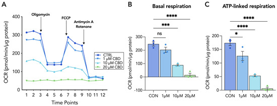 Mitochondrial function is impaired following 20 µM CBD treatment in STs. Differentiated (ST) BeWo b30 cells were treated with 1, 5, 10 and 20 µM CBD for 48 h at which point the mitochondrial stress test was conducted. Basal OCR measurements were obtained using the Seahorse XFe24 Analyzer and following the sequential addition of compounds oligomycin, FCCP and antimycin A/rotenone, with values being normalized to total protein content via BCA assay (μg/mL). Detection of OCR was performed with four biological replicates per experiment, for each treatment condition, and repeated four more times. Group mean and SEM (A–C) are displayed. Arrows indicate addition of respective compounds. Significance was assessed by Student’s t-test (* p < 0.05, *** p < 0.001, **** p < 0.0001; ns, non-significant). (A) Representative oxygen consumption rate (OCR) tracing, (B) basal respiration and (C) ATP-linked respiration.