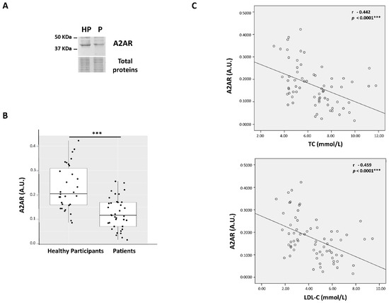 Expression of A2AR in PBMCs of hypercholesterolemia patients and HP was analyzed, quantified, and found to be significantly lower (46% lower) in HC patients (P) compared to HP [0.124 ± 0.064 arbitrary units (A.U.) vs. 0.229 ± 0.092 A.U., p < 0.0001] (Figure 1A,B). Additionally, we observed that A2AR expression was negatively correlated to both TC (r = −0.442, p = 0.001) and LDL-C (r = −0.459, p < 0.0001) blood levels (Figure 1C).