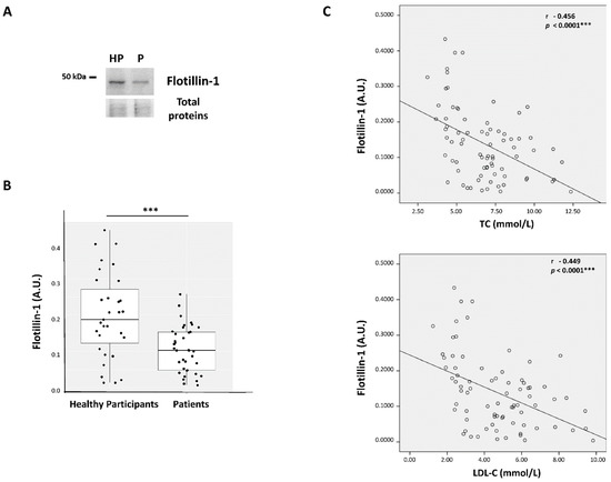 Flotillin-1 expression is found to be lower in hypercholesterolemic patients compared to healthy participants and negatively correlates to TC or LDL-C blood levels. Representative image of the Flotillin-1 47k Da band visualized by Western blot in PBMCs from HP or hypercholesterolemic patients (P) (A). After Image J densitometry analysis, Flotillin-1 expression was expressed in arbitrary units (A.U.) as the ratio of the intensities between the Flotillin-1 47 kDa band and the stained total protein band. Individual A.U. values represent the mean ± SD from three separate experiments. t-tests were used for comparisons between groups (p < 0.0001 ***) (B). Flotillin-1 expression levels (in A.U.) for the whole subject group (hypercholesterolemic patients and HP) were correlated to TC or LDL-C blood levels. Pearson’s correlation coefficient and the coefficient of determination r2 were calculated, p ≤ 0.05 was considered significant (C).