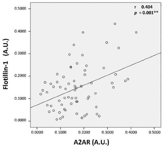 To investigate the possible mechanism of the decreased expression of A2AR, we analyzed, in parallel, the expression of Flotillin-1, a protein associated with lipid raft microdomains in the plasma membrane [39], whose localization is correlated with intracellular cholesterol distribution [40]. We found that Flotillin-1 expression was significantly lower (53% less) in HC patients compared to HP (0.105 ± 0.063 vs. 0.198 ± 0.117 A.U., p < 0.0001) (Figure 2A,B). Moreover, as seen for A2AR, a negative correlation was seen between Flotillin-1 expression and TC (r = −0.456, p < 0.0001) and LDL-C (Pearson r = −0.449, p < 0.0001) (Figure 2C). Interestingly, A2AR expression was also positively correlated with Flotillin-1 expression levels (r = 0.404, p = 0.001) (Figure 3).