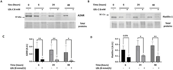 To investigate whether the effect of high LDL-C levels is a direct cellular response, we incubated healthy individual PBMCs with or without highly LDL-C-enriched (8 mM final concentration) medium. As shown in Figure 4, A2AR expression decreased rapidly and significantly over time in the presence of LDL-C compared to control (without LDL-C-enrichment) (Time 6 h: 0.058 ± 0.006 (+) vs. 0.344 ± 0.165 (−) A.U., p = 0.003; T24 h: 0.050 ± 0.094 (+) vs. 0.313 ± 0.132 (−) A.U., p = 0.006; T48 h: 0.023 ± 0.033 (+) vs. 0.249 ± 0.173 (−) A.U., p = 0.020; n = 3) (Figure 4A). Moreover, a decrease in the Flotillin-1 47 kDa band was also observed at these time points (T6 h: 0.082 ± 0.039 (+) vs. 0.210 ± 0.070 (−) A.U., p = 0.078; T24 h: 0.108 ± 0.021 (+) vs. 0.279 ± 0.092 (−) A.U., p = 0.017; T48 h: 0.097 ± 0.061 (+) vs. 0.285 ± 0.064 (−) A.U., p = 0.009).