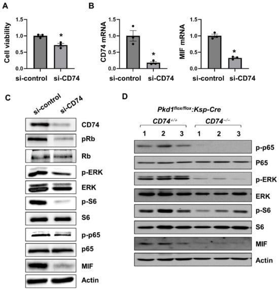 To determine a direct effect of CD74 on renal cell proliferation and its associated signaling pathways, first, we found that knockdown of CD74 decreased Pkd1 mutant renal epithelial cell proliferation as examined with MTS assay (Figure 3A). The knockdown efficiency of CD74 with siRNA was confirmed by qRT-PCR analysis (Figure 3B). Knockdown of CD74 also decreased the phosphorylation of ERK, S6, Rb, and p65, but not the expression of their total proteins (Figure 3C) in Pkd1 mutant renal epithelial cells. In addition, knockout of CD74 also decreased the activation and phosphorylation of ERK, S6, and p65 in Pkd1 conditional knockout kidneys (Figure 3D). These results suggest that CD74 regulates Pkd1 mutant renal epithelial cell proliferation through PKD associated signaling pathways. The downregulation of MIF mRNA and protein (Figure 3B–D) in CD74 knockdown cells and knockout kidneys is unexpected, suggesting that there is a positive feedback loop between MIF and CD74.
