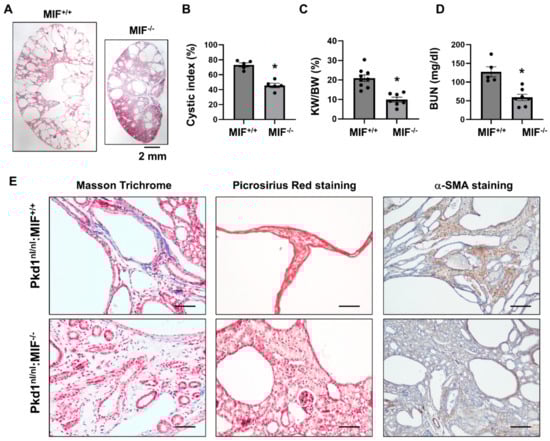 Knockout of MIF in Pkd1nl/nl mice delayed cyst formation and ameliorated the interstitial fibrosis. (A) Histologic examination of PN28 kidneys from Pkd1nl/nl:MIF+/+ (MIF+/+) mice (n = 9) and Pkd1nl/nl:MIF−/− (MIF−/−) mice (n =7). Scale bar: 2 mm. (B) Cystic index was significantly decreased in PN28 kidneys from MIF−/− mice compared to MIF+/+ mice. Mean ± SEM of all sections quantified for each condition are shown. (C,D) KW/BW ratios (C) and BUN levels (D) of PN28 CD74+/+ and CD74−/− mice. Mean ± SEM. * p ≤ 0.05 is shown by student’s t-test. (E) The Masson Trichrome (blue, collagen), Picrosirius Red (Red, collagen) and α-SMA (Brown, α-SMA) staining of kidneys from PN28 Pkd1nl/nl:MIF+/+ (MIF+/+) and Pkd1nl/nl:MIF−/− (MIF−/−) mice.