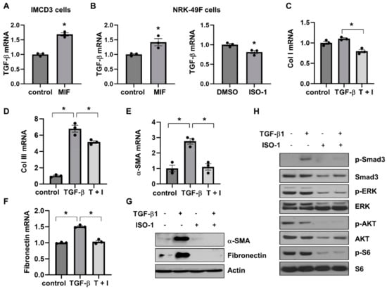 The association of MIF/CD74 and TGF-β/Smad3 pathways. (A) The mRNA expression of TGF-β in IMCD3 cells stimulated with MIF or vehicle control. (B) The mRNA expression of TGF-β in NRK-49F cells stimulated with MIF or vehicle control, and NRK-49F cells treated with ISO-1 or vehicle control. n = 3. * p ≤ 0.05 by Mann-Whitney U test. (C–F) The mRNA expression of Col I (C), Col lll (D), α-SMA (E), and fibronectin (F) in NRK-49F cells treated with TGF-β, TGF-β plus ISO-1, or vehicle control. n = 3. * p ≤ 0.05 by one-way ANOVA test. (G) Western blot analysis of the expression of α-SMA and fibronectin in NRK-49F cells treated with TGF-β, ISO-1, TGF-β plus ISO-1, or vehicle control for 48 h. (H) Western blot analysis of the expression of phospho-Smad3, Smad3, phospho-ERK, ERK, phospho-AKT, AKT, phospho-S6 and S6 in NRK-49F cells treated with TGF-β, ISO-1, TGF-β plus ISO-1, or vehicle control for 30 min.