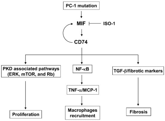 A schematic diagram depicting CD74-medicated pathways in ADPKD. CD74 regulates (1) cystic renal epithelial cell proliferation by activation of PKD associated pathways, including ERK, mTOR, and Rb, (2) the activation of NF-κB to increase the expression of TNF-α and MCP-1, leading to the accumulation of macrophages in ADPKD kidneys, (3) the transcription of fibrotic marker genes to regulate renal fibrosis, and (4) the transcription of MIF to form a positive feedback loop, to promote cyst growth and renal fibrosis in ADPKD.