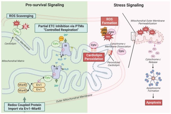Functions of Cytc divided into survival (left) and stress signaling functions (right). This figure was created using BioRender.com (accessed on 27 February 2024).