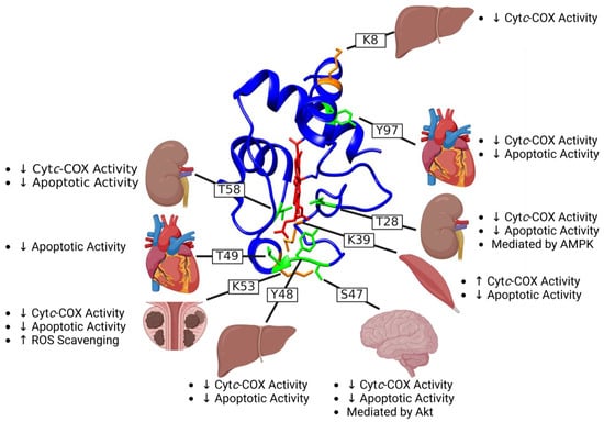 Tissue-specific phosphorylation (green) and acetylation (orange) sites of Cytc mapped in mammalian tissues and their consensus functional effects. Discovery order: Y97 (heart), K8 (fasted liver), Y48 (liver), T28 (kidney), S47 (brain), T58 (kidney), K53 (prostate cancer xenografts), T49 (aged heart), K39 (ischemic tibialis anterior skeletal muscle). The heme group is annotated in red. The protein backbone is in blue except for serine/threonine/tyrosine residues that can be phosphorylated are in green and lysine residues that can be acetylated are in orange. The down arrow (↓) refers to decreased activity while the up arrow (↑) refers to increased activity. This figure of Cytc (5c0z.pdb) was created using UCSF Chimera (v1.16) for protein visualization followed by BioRender.com (accessed on 27 February 2024).