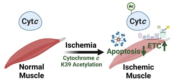 Tibialis anterior skeletal muscle Cytc gains a post-translational modification during ischemia, activating electron transport chain flux and inhibiting apoptosis. In contrast to phosphorylations that are present under normal conditions but lost during ischemia in tissues such as brain, liver, kidney, and heart, Cytc from tibialis anterior muscle becomes K39-acetylated during ischemia. This modification may explain resilience of skeletal muscle to ischemia-reperfusion injury because this acetylation inhibits the execution of apoptosis while activating respiration to quickly restore ATP production. This figure was created using BioRender.com (accessed on 27 February 2024).