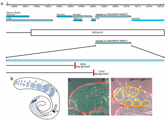 - Mathe, E.; Bates, H.; Huikeshoven, H.; Deak, P.; Glover, D.M.; Cotterill, S. Importin-alpha3 is required at multiple stages of Drosophila development and has a role in the completion of oogenesis. Dev. Biol. 2000, 223, 307–322. [Google Scholar] [CrossRef]