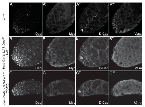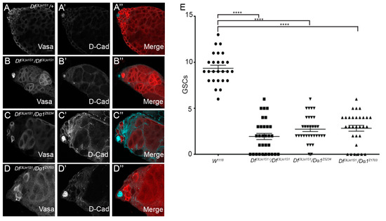 3.4. Expression of a Dα1 Dominant Negative Transgene in GSCs Confirms a Functional Requirement for Dα1 in GSC Maintenance