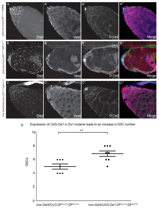 Expression of a UAS-Dα1 transgene in early germline cells of Dα1 homozygous deficiency mutant rescues germ cell loss. (A–A’’’) Representative confocal micrographs of testes dissected from newly eclosed UAS-Dα1/CyO; Df(3L)α1S1/Tm6B control; (B–B’’’) UAS-Dα1/CyO; Df(3L)α1S1/Df(3L)α1S1 deficiency mutant and (C–C’’’) nanos-Gal4/UAS-Dα1; Df(3L)α1S1/Df(3L)α1S1 flies. Labelling with Dapi (DNA), Vasa (germ cells) and D-Cad (hub and cyst cells) shows that loss of germ cells in the deficiency mutant (B–B’’’) could be rescued when Dα1 is expressed in early germ cells via nanos-Gal4 in a deficiency background (C–C’’’); (D) Scatterplot and statistical analysis showing that the loss of GSCs in deficiency mutants [average of (5 (±1)) GSCs in newly eclosed animals] could be at least partially rescued when a UAS-Dα1 transgene is expressed in early germ cells in the Dα1 deficiency background [average of (6.87 (±1.13)) GSCs]. ** p < 0.01. Scale Bars, 20 μm.