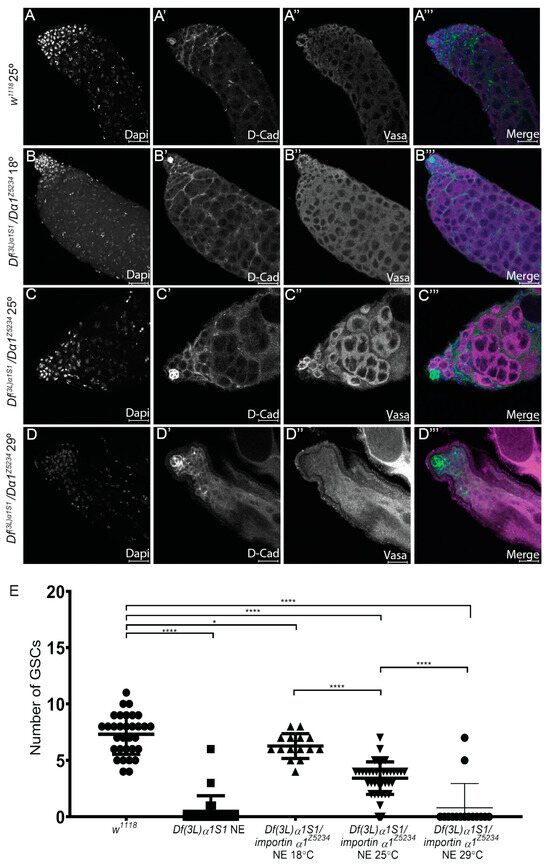 Our analysis to date has shown a requirement for Dα1 in the maintenance of GSCs. Interestingly, quantification of GSC numbers in testes dissected from newly eclosed Dα1 mutant adults (Figure 3D) and aged flies (Figure 2E) indicated that loss of Dα1 results in the progressive loss of GSCs over time. We questioned whether challenging Dα1 mutants by increasing the temperature at which they were raised would affect the rate of GSC loss, as ezymatically driven developmental processes may be expected to be more rapid at higher temperatures, perhaps pointing to a function for Dα1 in regulating the rate of GSC division. To this end, we characterised (by immunofluorescence) testes dissected from newly eclosed Df(3L)α1S1/Dα1Z5234 mutant flies raised at either 18 °C, 25 °C or 29 °C from the time of mating. Testes dissected from w1118 (control) adult males reared at 25 °C and Df(3L)α1S1/Dα1Z5234 mutants reared at 18 °C appeared similar in morphology (Figure 4A–B’’’), and mutant testes exhibited no obvious cellular defects (Figure 4B–B’’’). In contrast, testes dissected from Df(3L)α1S1/Dα1Z5234 reared at either 25 °C or 29 °C exhibited a loss of Vasa-positive germ cells (Figure 4C–C’’’). Quantification of the number of GSCs in each of these samples confirmed that the severity of stem cell loss in Df(3L)α1S1/Dα1Z5234 correlated with an increase in temperature (Figure 4E), with mutants reared at 29 °C exhibiting similar GSC numbers to testes dissected from newly eclosed Df(3L)α1S1 homozygotes raised at 25 °C (Figure 4E). This is suggestive of the temperature-sensitive nature of Dα1Z5234, but these results also raise the possibility that other genes lost as a result of the deficiency could contribute to the loss of function phenotype in the homozygote deficiency strain.
