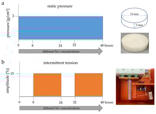 Schematic representation of the performed experiments. Mouse synovial fibroblasts from knee joints were incubated in different Na+ concentrations (−20 mM, ±0 mM, +50 mM) for a total of 48 h. For compressive force treatment, a sterile ZnO2 plate (2 g/cm2), as illustrated on the right side, was placed on the synovial fibroblasts for 48 h (a). Intermittent cyclic tension was performed for at least 48 h with two cycles of 8 h at a 0% amplitude followed by 16 h at a 15% amplitude using a cell stretching machine (b). The piston (marked with the blue arrow) pushes the stamps (green arrows) upwards according to the specified frequency and amplitude. The light gray metal block contains a collagen-coated 6-well Bioflex plate with a flexible underside.