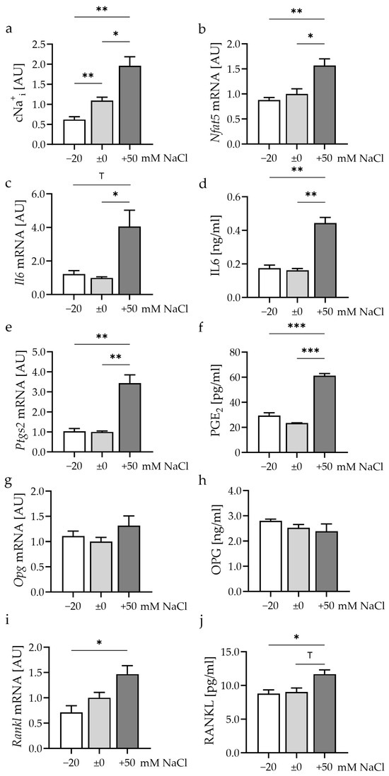 Impact of different extracellular NaCl concentrations for 48 h on relative Na+i content ((a); n = 7), Nfat5 mRNA (b), Il6 mRNA (c) and IL6 protein secretion (d), Ptgs2 mRNA (e) and PGE2 secretion (f), Opg mRNA (g) and OPG protein secretion (h), as well as Rankl mRNA (i) and RANKL protein secretion (j). mRNA expression: n ≥ 7; protein secretion: n = 4. Statistics: Welch-corrected ANOVA with Dunnett’s T3 multiple comparisons test; T p < 0.1; * p < 0.05; ** p < 0.01; *** p < 0.001.
