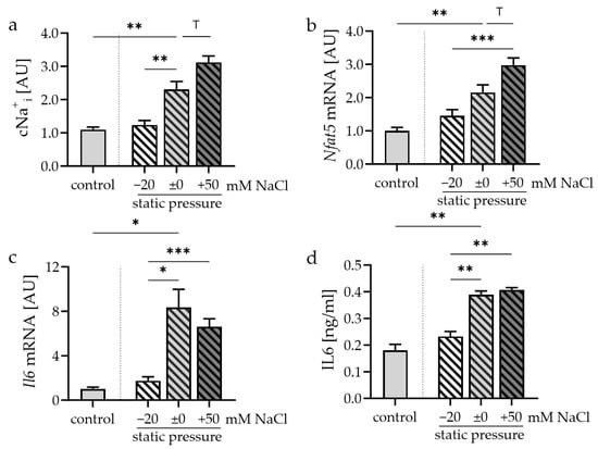 Il6 mRNA expression (p = 0.011; Figure 3c) and IL6 protein secretion (p = 0.002; Figure 3d) were elevated in reaction to static pressure application. The reduction of extracellular NaCl by −20 mM decreased pressure-induced Il6 gene (p = 0.016) and protein expression (p = 0.003). Under high salt conditions, there was no further detectable increase in Il6 expression or release (Figure 3c,d). Compressive strain increased Ptgs2 mRNA (p = 0.010; Figure 3e). Additional extracellular NaCl tended to further elevate Ptgs2 gene expression after static pressure application (p = 0.087), while an additional reduction in extracellular sodium chloride content reduced Ptgs2 mRNA (p = 0.055; Figure 3e). Compressive force application increased PGE2 secretion (p < 0.001; Figure 3f). This response was further increased by additional exposure to high extracellular NaCl conditions (p ≤ 0.023).