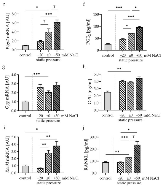 Impact of different extracellular NaCl concentrations during static pressure application on relative Na+i ((a); n = 7), Nfat5 (b), IL6 mRNA (c) and protein secretion (d), Ptgs2 mRNA (e) and PGE2 secretion (f), OPG mRNA (g) and protein secretion (h), as well as RANKL mRNA (i) and protein secretion (j). mRNA expression: n ≥ 7; protein secretion: n = 4. Statistics: Welch-corrected ANOVA with Dunnett’s T3 multiple comparisons test; T p < 0.1; * p < 0.05; ** p < 0.01; *** p < 0.001.