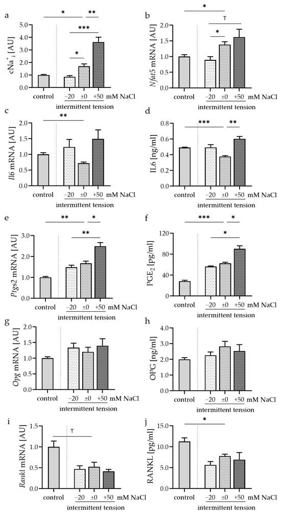 Impact of different extracellular Na+ concentrations during intermittent tension on Nai+ level ((a); n = 8), Nfat5 (b), IL6 mRNA (c) and protein secretion (d), Ptgs2 mRNA (e) and PGE2 secretion ((f) OPG mRNA (g) and protein secretion (h), as well as RANKL mRNA (i) and protein secretion (j). mRNA expression: n ≥ 7; protein secretion: n = 4. Statistics: Welch-corrected ANOVA with Dunnett’s T3 multiple comparisons test; T p < 0.1; * p < 0.05; ** p < 0.01; *** p < 0.001.