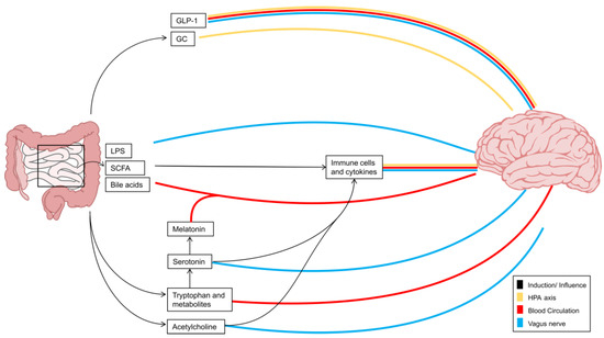 Interorgan signaling via gut–brain pathways. Interorgan communication between the CNS and the gut is implemented by a range of molecules which transmit information to the brain via several different pathways. These pathways comprise the vagus nerve, the hypothalamic–pituitary–adrenal axis, and the blood circulation. While neurotransmitters such as acetylcholine or serotonin communicate primarily via the vagus nerve, serotonin precursors and derivatives tend to travel via the bloodstream. Gut-derived LPS, SCFAs, or bile acids likewise transmit information along the vagus nerve or reach the brain via the bloodstream; however, they also interact with immune cells and thus influence the release of cytokines, thereby providing an additional indirect communication pathway between the gut and the brain. Intestinal hormones such as GLP1 and GC additionally signal via the HPA axis. Black arrows illustrate the induction or influence of the signals on each other. The blood circulation is shown in red, the vagus nerve in blue, and the HPA axis in yellow. GC: glucocorticoids, GLP-1: glucagon-like peptide-1, HPA: hypothalamic–pituitary–adrenal axis, LPS: lipopolysaccharide, SCFA: short-chain fatty acid.