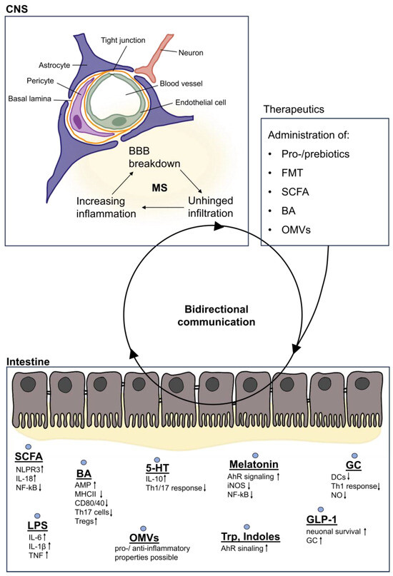 The vascularization of the intestine extends to the epithelial cell layer. Together with the overlying mucosal layer, and the underlying lamina propia, housing immune cells, they form the different layers within the intestinal barrier and thereby provide essential metabolic function. Its main purpose is to prevent harmful substances from entering the bloodstream while facilitating the absorption of microbiome-derived products, such as nutrients, proteins, or fatty acids, which are absorbed and transported into the blood across the epithelial cell layer [86]. This transport can be active via transporters or passive by diffusion. Moreover, the semipermeable nature of the mucosa limits the transport of potentially harmful components, thereby contributing to intestinal integrity and homeostasis [87]. Apart from the mucosa, this barrier homeostasis is mainly achieved by the epithelial monolayer and its intercellular tight junctions, which are essential for regulated absorption, as they allow water and ions to pass between the epithelial cells, whilst preventing microbes or larger molecules from crossing, thus offering protection against infection [88]. Dysfunction of the intestinal barrier is also referred to as “leaky gut” and is associated with numerous diseases, including inflammatory bowel disease, AD, and MS [89]. It is conceivable that these disorders are at least partially mediated by the unhindered release of microbial mediators into the circulation, leading to aberrant responses in both the periphery and CNS.