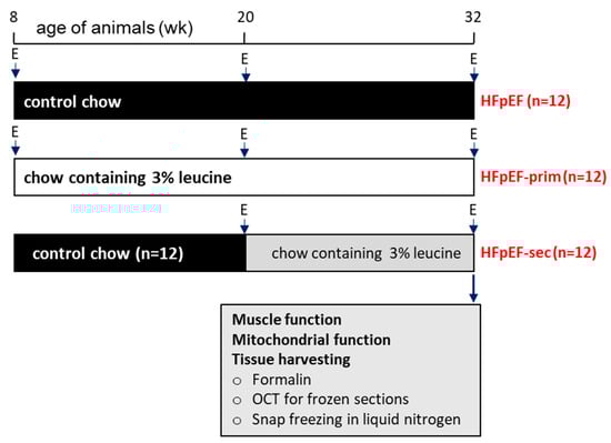In total, 36 female ZSF1 obese rats (Charles River Laboratories, Sulzfeld, Germany) were used in this study. The animals were randomized into three groups: HFpEF (n = 12, animals were fed standard chow throughout the experiment); HFpEF-prim (n = 12, primary prevention group, animals were fed with standard chow enriched with 3% leucine starting at an age of 8 weeks); and HFpEF-sec (n = 12, secondary prevention group, animals were fed with standard chow enriched with 3% leucine starting at an age of 20 weeks, when HFpEF had already developed) (Figure 1). All animals were maintained under regular conditions: controlled temperature (24 ± 1 °C, 12 h light–dark cycle), food and water provided ad libitum. The leucine concentration of 3% was chosen based on earlier studies by our group [,]. The time points for initiating the therapy with leucine at 8 and 20 weeks were chosen based on earlier studies showing that at 8 weeks no signs of HFpEF or skeletal muscle dysfunction were seen, whereas at 20 weeks of age, muscle dysfunction and diastolic dysfunction with preserved ejection fraction were evident [].