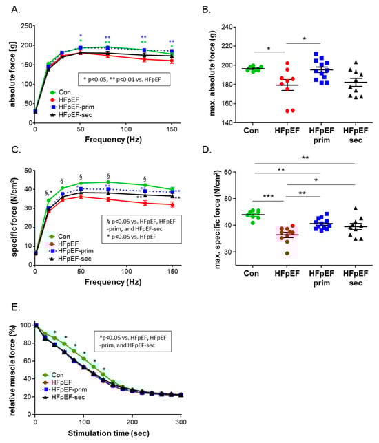 Analyzing the skeletal muscle function of the soleus muscle ex vivo in an organ-bath setting revealed a significantly enhanced absolute (Figure 2A,B) and muscle-specific force (Figure 2C,D) in HFpEF-prim compared to HFpEF. At least for the absolute force generation, the value of the HFpEF-prim group was not different compared to the control group. With respect to muscle fatigue, all the HFpEF animals showed a significantly lower fatigue level compared to the control animals. No impact of leucine treatment with respect to muscle fatigue was evident (Figure 2E).