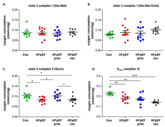 Effect of leucine supplementation on mitochondrial respiratory function of HFpEF animals. Stimulation of complex I with glutamate/malate (Glut/Mal) (A) or Glut/Mal/octanoylcarnitin (Octa) (B) was comparable between groups. Furthermore, stimulation of complex II with succinate (C) revealed a significant increase in oxygen consumption in HFpEF-prim when compared to HFpEF and HFpEF-sec. To measure the maximal respiration of complex IV (D), ascorbate (Asco) and the electron-donating compound, tetramethyl-p-phenylene diamine (TMPD), were added after the addition of the mitochondrial uncoupler FCCP. No significant differences were observed between the three HFpEF groups, which all showed a lower respiration rate compared to the control group. * p < 0.05, ** p < 0.01, *** p < 0.001.