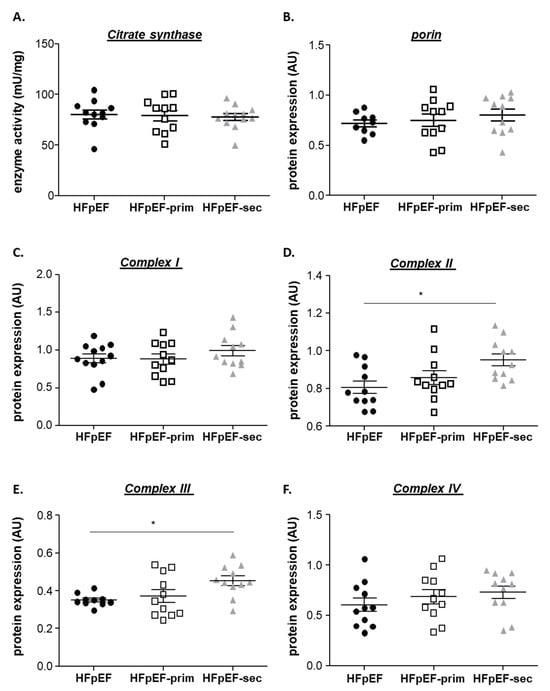 To investigate if alterations in mitochondrial respiration were related to changes in overall mitochondrial content or different expression levels of the respiratory chain complexes, Western blot analysis and enzyme activity measurements were performed. For the assessment of mitochondrial content, citrate synthase activity (Figure 4A) and the protein expression of porin (VDAC) (Figure 4B) were quantified. No differences for both markers were noticed between all groups. Regarding protein expression of the respiratory chain complexes I-IV (Figure 4C–F), a small but significant upregulation was detected for complex II and III in HFpEF-sec compared to HFpEF. Protein expression levels of complex I (Figure 4C) and IV (Figure 4F) were comparable between all groups.