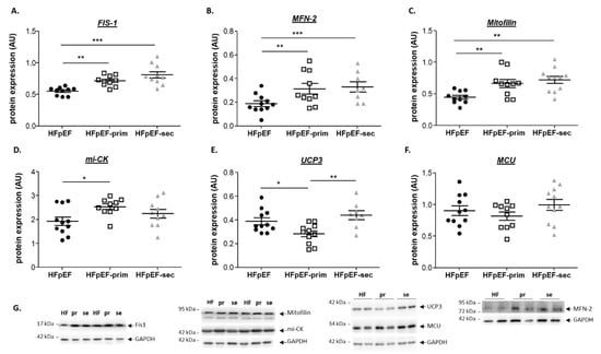 Western blot analyses were performed to quantify the protein expression of proteins involved in modulating mitochondria, like Fis1 (Fission, Mitochondrial 1), mitofilin, mitochondrial creatine kinase (mi-CK), UCP3 (uncoupling protein 3), and mitochondrial Ca2+ uniporter (MCU). The expressions of Fis1 and Mfn-2, proteins involved in mitochondrial fusion and fission, were significantly increased in the soleus muscle of HFpEF-prim and HFpEF-sec compared to untreated HFpEF (Figure 5A,B). Mitofilin (also known as Mic60) plays critical roles in cristae organization, protein transport, mitochondrial DNA transcription, and ATP generation. Analyzing the expression of mitofilin in the soleus muscle of the three groups showed a significant upregulation in HFpEF-prim and HFpEF-sec compared to HFpEF (Figure 5C). Mi-CK, an enzyme responsible for the transfer of high-energy phosphate from the mitochondria to the cytosol, was significantly upregulated in HFpEF-prim compared to HFpEF (Figure 5D). UCP3, a protein facilitating the transfer of protons from the outer to the inner mitochondrial membrane and thereby reducing the mitochondrial membrane potential, was significantly reduced in the soleus muscle of HFpEF-prim animals compared to HFpEF and HFpEF-sec animals (Figure 5E). No difference was noted between the three groups for MCU (Figure 5F), a transmembrane protein that allows the passage of calcium ions from a cell’s cytosol into the mitochondria. Representative Western blots for the proteins mentioned above are depicted in Figure 5G.