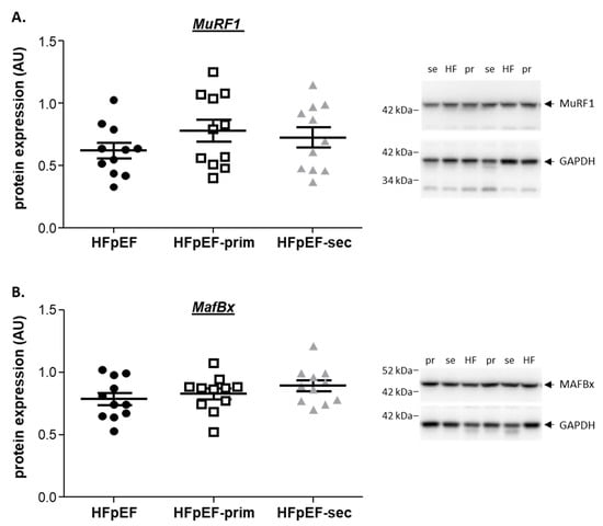 Frozen muscle samples were homogenized in Relax buffer (90 mmol/L HEPES, 126 mmol/L KCl, 36 mmol/L NaCl, 1 mmol/L MgCl, 50 mmol/L EGTA, 8 mmol/L ATP, 10 mmol/L Creatinphosphate; pH 7.4) containing a protease inhibitor mix (Inhibitor mix M, Serva, Heidelberg, Germany). The BCA assay (Pierce, Bonn, Germany) was used to measure protein concentration and the aliquots (5–20 μg) were separated by SDS-polyacrylamide gel electrophoresis. After transfer of the proteins to a polyvinylidene fluoride membrane (PVDF), the PVDF membrane was blocked with 5% milk and incubated overnight at 4 °C using the following primary antibodies: MafBx, (1:1000, Abcam, Cambridge, UK); total OXPHOS components (1:250, Abcam, Cambridge, UK); Fis1, porin (VDAC1), and mi-CK (all 1:1000, Proteintech, Planegg-Martinsried, Germany); MCU (1:1000, CellSignaling, Danvers, MA, USA); UCP3 (1:1000, Thermo Fisher, Waltham, MA, USA); mitofilin and MuRF1 (all 1:200, Santa Cruz, Heidelberg, Germany). After a short wash, the membranes were incubated with a horseradish peroxidase-conjugated secondary antibody and specific bands were visualized by chemiluminescence (Super Signal West Pico, Thermo Fisher Scientific Inc., Bonn, Germany). To quantify protein expression, densitometry was performed using the 1D scan software package version 15.08b (Scanalytics Inc., Rockville, MD, USA), and measurements were normalized to the loading control GAPDH (1/5000; HyTest Ltd., Turku, Finland). Full western blot pictures are depicted in the Supplementary Materials.