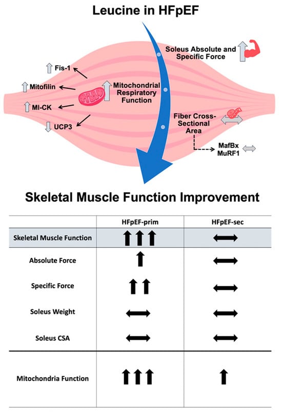 A summary of the beneficial impacts of leucine supplementation on skeletal muscle dysfunction as observed in HFpEF. ↑ increased vs. HFpEF;