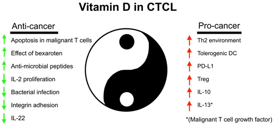 Most of the symptoms related to CTCL, such as itch, pain, and skin lesions, are the results of inflammatory processes [91,155]. As vitamin D has anti-inflammatory properties [72], it is possible that vitamin D could alleviate inflammation-associated symptoms. On the other hand, vitamin D also promotes a series of immunological changes, which could promote—rather than inhibit—symptoms and disease progression. First, vitamin D enhances Th2 immune responses [24,52,53,55]. As the Th2 cytokines IL-4 and IL-13 are growth factors for malignant T cells and induce the repression of filaggrin in the skin [124,159], vitamin D could indirectly enhance malignant proliferation, disease progression, and the deterioration of the skin barrier (Figure 2, right side). Furthermore, vitamin D inhibits Th1 responses and IL-2-driven proliferation while promoting Treg, tolerogenic macrophages, and dendritic cells, as well as the expression of immune checkpoint molecules such as PD-L1 and PD-L2 [16,21,160,161,162,163,164,165,166], suggesting that vitamin D may also inhibit anticancer immunity (Figure 2, right side). Taken together, these seemingly opposing effects described above indicate that vitamin D may have both beneficial and harmful effects depending on the context, suggesting a complex role of vitamin D in CTCL biology (Figure 2).