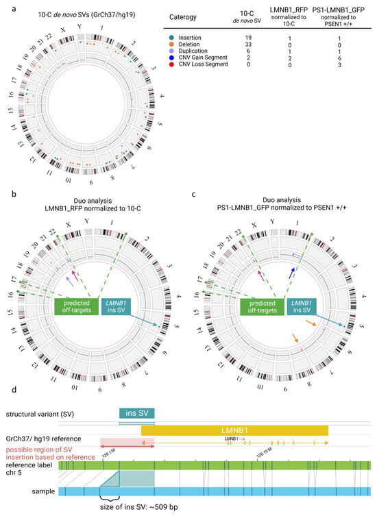 Quality assessment of genomic integrity in hiPSCs after gene editing and long-term culture using optical genome mapping. (a) Circos plot of 10-C hiPSC line normalized to the human genome reference GrCh37/h19 presenting multiple SVs and CNVs as detailed in the legend. (b) Duo analysis for LMNB_RFP hiPSC normalized to 10 C. The chromosome 22 variant (pink arrow) is detected by CNV pipeline (blue line). The variant on chromosome 20 (purple arrow) is detected by both CNV (blue line) and SV (purple dot). Modification coincident with RFP fluorophore on chromosome 5 (green arrow) is detected by SV pipeline (green dot). (c) Duo analysis for PS1-LMNB_GFP hiPSC normalized to PSEN1 +/+. The chromosome 22 copy number gain (pink arrow) is detected CNV pipeline (blue line). The chromosome 1 variant (dark blue arrow) is detected by CNV pipeline (blue line). Copy number losses on in chromosome 6 and 8 (orange arrows) are detected by CNV (red lines) pipeline. Modification coincident with GFP fluorophore on chromosome 5 (green arrow) is detected as SV (green dot). Predicted off-target sites by CasOFFinder tool are indicated in (b) and (c) (green dashed line). (d) Detail view of insertion on chromosome 5 in LMNB1 gene.