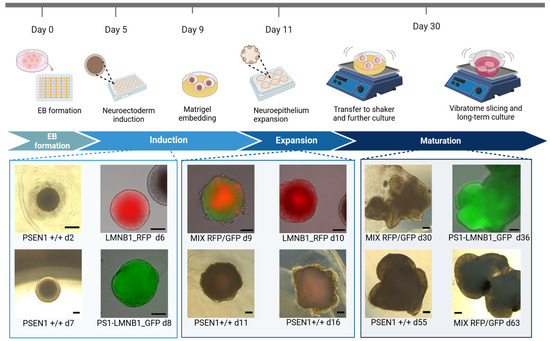 Gene-edited hiPSC lines (PS1-LMNB1_GFP and LMNB1_RFP) were used to develop organoids following the protocol published by Lancaster and Knoblich [13] with minor modifications, as described in Bachmann et al., 2022 [14]. Briefly, on days 1 and 2 after seeding, the EBs were monitored for their appearance and size using a light microscope. If the EBs showed blurred edges or a diameter < 300 μm, half of the medium was aspirated and exchanged with 150 μL fresh hESC medium containing 4 ng/mL bFGF (Peprotech, Cranbury, NJ, USA) and 50 μM ROCK inhibitor (Rho-kinase inhibitor, Y-27632; STEMCELL™ Technologies). On day 3, the medium was changed to hESC medium without supplements. On day 6, the medium was changed to neural induction medium and then changed every other day until day 11 or 12, when EBs were embedded in Matrigel® (GFR) Basement Membrane Matrix (Corning®, Corning, NY, USA) droplets. Afterward, organoids were kept for long-term culture.